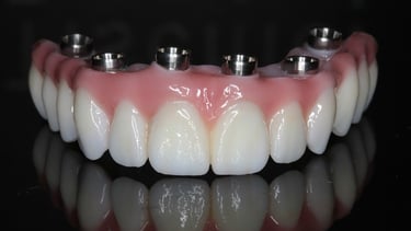 Reposição de dentes perdidos com implantes fixos e naturais, devolvendo função e estética.